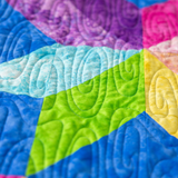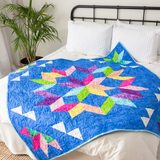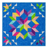 | Design | Vibrant starburst pattern with colorful half-square triangles on a blue background |