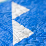 The Pool Party quilt combines classic techniques with a fresh, modern look. The central star bursts with color against the blue background, while corner accents add balance and visual interest. Whether displayed on a bed, couch, or wall, this 62" square throw makes a statement in any space.